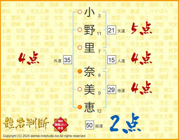 小(3画)野(11画)里(7画) 奈(8画)美(9画)恵(12画)