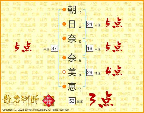 朝(12画)日(4画)奈(8画) 奈(8画)美(9画)恵(12画)