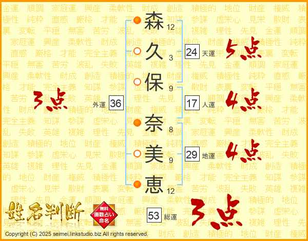 森(12画)久(3画)保(9画) 奈(8画)美(9画)恵(12画)