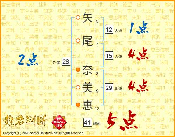 矢(5画)尾(7画) 奈(8画)美(9画)恵(12画)