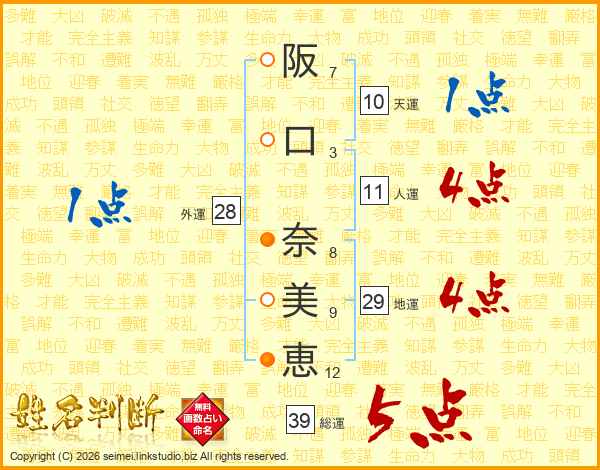 阪(7画)口(3画) 奈(8画)美(9画)恵(12画)