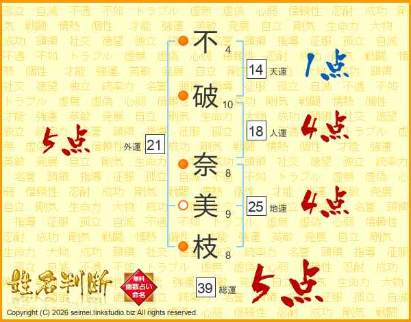 不(4画)破(10画) 奈(8画)美(9画)枝(8画)