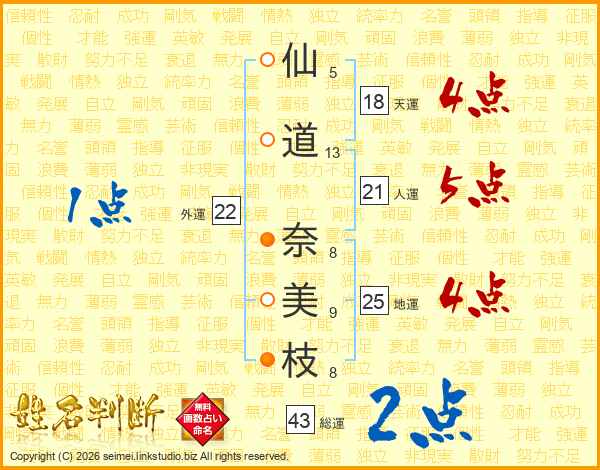 仙(5画)道(13画) 奈(8画)美(9画)枝(8画)