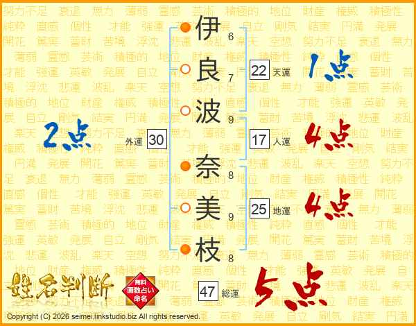 伊(6画)良(7画)波(9画) 奈(8画)美(9画)枝(8画)