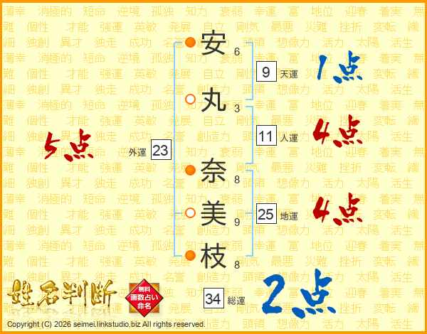 安(6画)丸(3画) 奈(8画)美(9画)枝(8画)