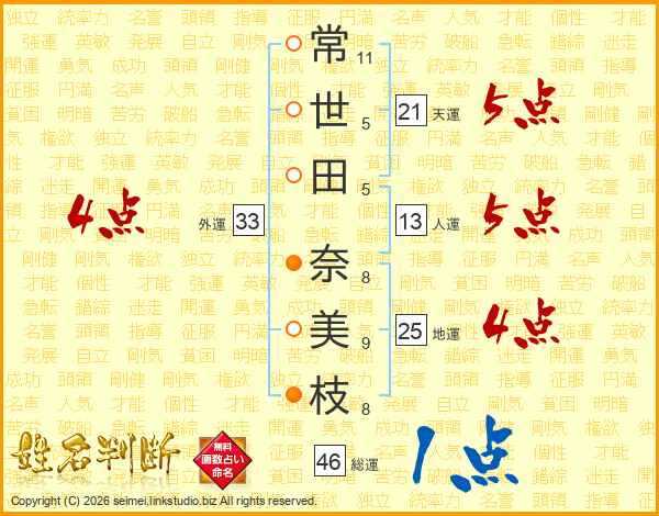 常(11画)世(5画)田(5画) 奈(8画)美(9画)枝(8画)