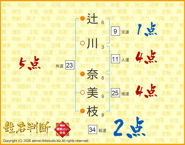 辻(6画)川(3画) 奈(8画)美(9画)枝(8画)