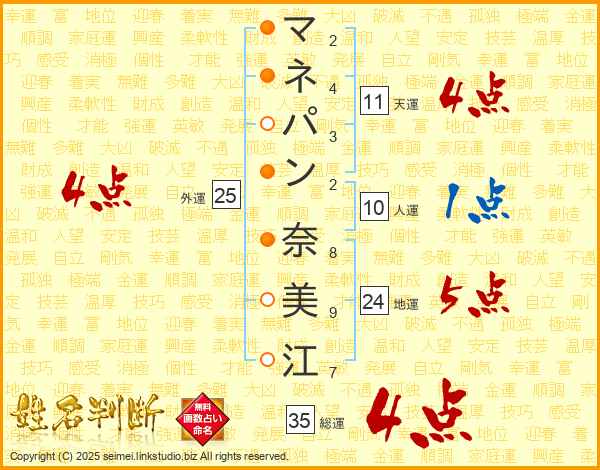 マ(2画)ネ(4画)パ(3画)ン(2画) 奈(8画)美(9画)江(7画)