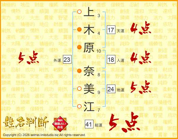 上木原奈美江さんの総運は41画の5点!