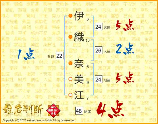 伊(6画)織(18画) 奈(8画)美(9画)江(7画)