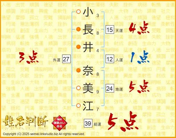 小(3画)長(8画)井(4画) 奈(8画)美(9画)江(7画)