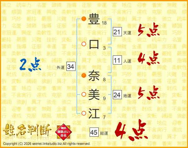 豊(18画)口(3画) 奈(8画)美(9画)江(7画)