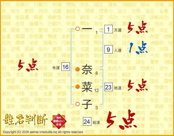 生活面を象徴する運勢です。外部から受ける影響力を表し、結婚運、家庭運や職場、環境への順応性を表します。総運から人運を引いた画数。姓や名が1文字の場合を除く。
