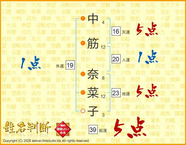 中(4画)筋(12画) 奈(8画)菜(12画)子(3画)
