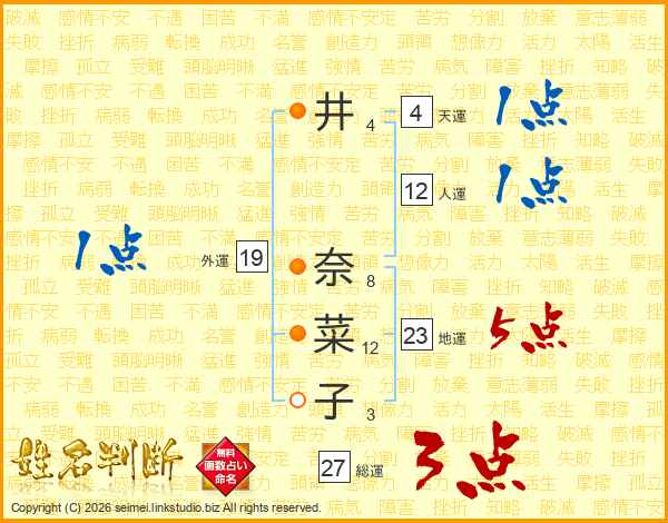 生活面を象徴する運勢です。外部から受ける影響力を表し、結婚運、家庭運や職場、環境への順応性を表します。総運から人運を引いた画数。姓や名が1文字の場合を除く。