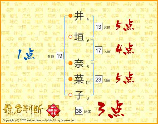 井(4画)垣(9画) 奈(8画)菜(12画)子(3画)