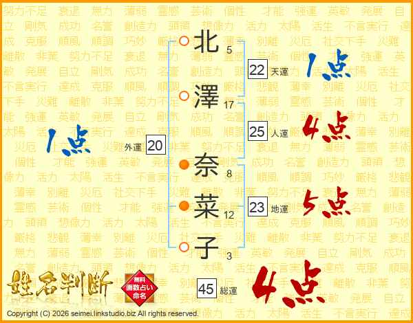 北(5画)澤(17画) 奈(8画)菜(12画)子(3画)
