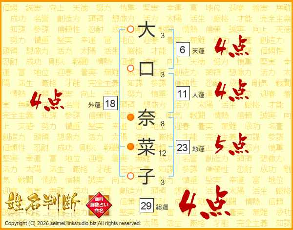 大(3画)口(3画) 奈(8画)菜(12画)子(3画)