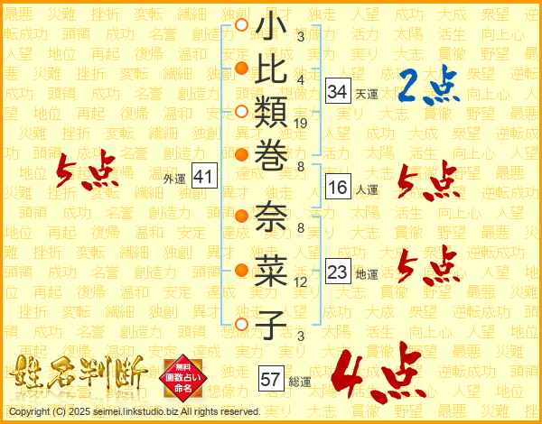 小(3画)比(4画)類(19画)巻(8画) 奈(8画)菜(12画)子(3画)