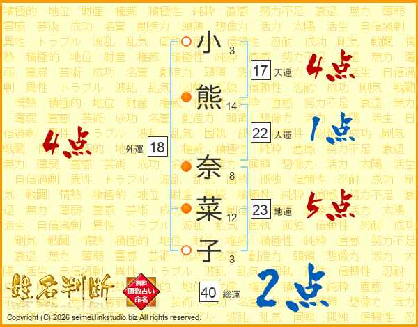 小(3画)熊(14画) 奈(8画)菜(12画)子(3画)