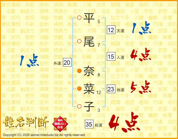 平(5画)尾(7画) 奈(8画)菜(12画)子(3画)