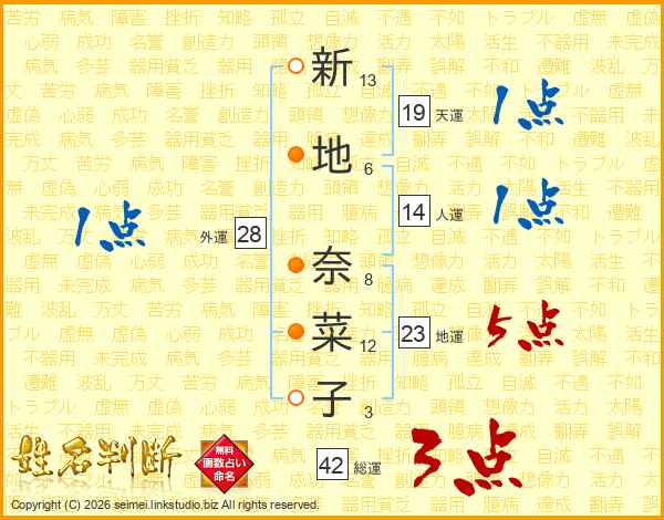 新(13画)地(6画) 奈(8画)菜(12画)子(3画)