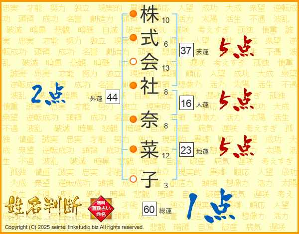 株(10画)式(6画)会(13画)社(8画) 奈(8画)菜(12画)子(3画)