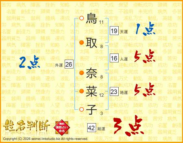 鳥(11画)取(8画) 奈(8画)菜(12画)子(3画)