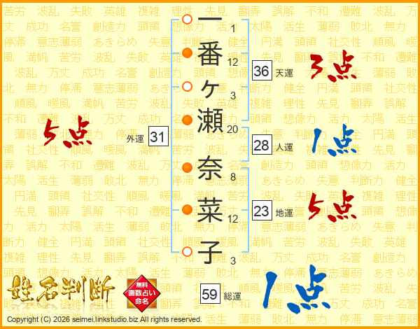 一番ヶ瀬奈菜子さんの総運は59画の1点!