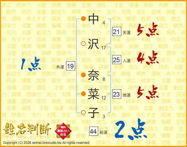 中沢奈菜子さんの総運は44画の2点
