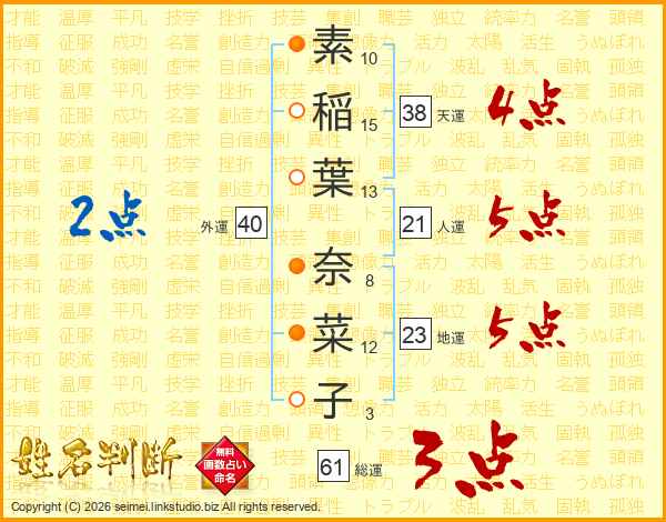 素(10画)稲(15画)葉(13画) 奈(8画)菜(12画)子(3画)