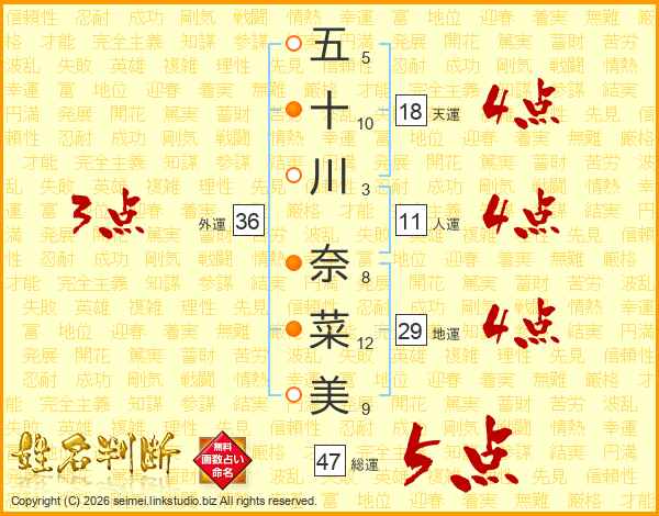 五(5画)十(10画)川(3画) 奈(8画)菜(12画)美(9画)