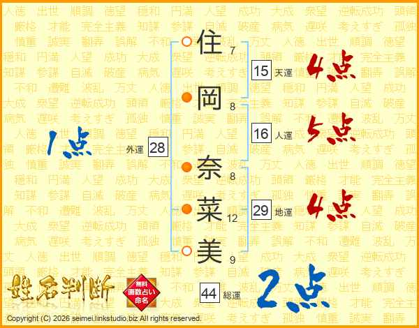 住(7画)岡(8画) 奈(8画)菜(12画)美(9画)