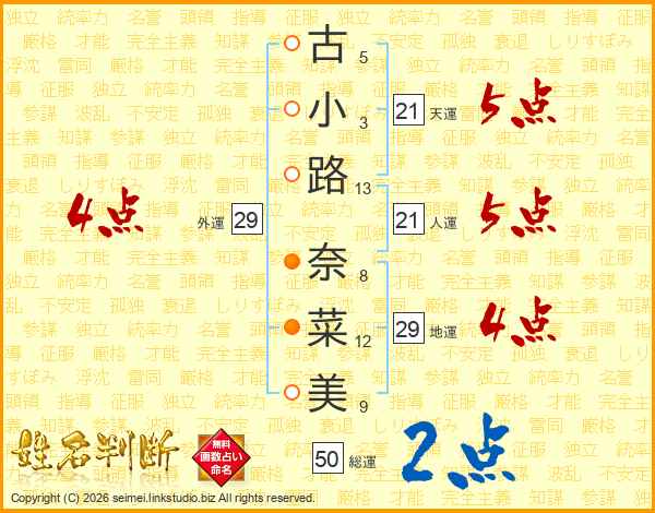 古(5画)小(3画)路(13画) 奈(8画)菜(12画)美(9画)