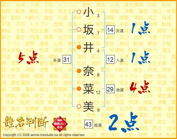 小(3画)坂(7画)井(4画) 奈(8画)菜(12画)美(9画)
