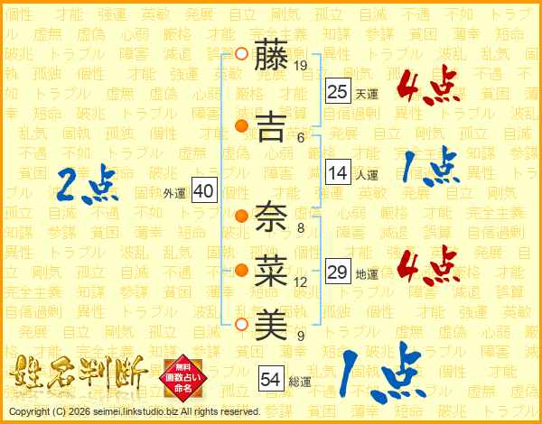 藤(19画)吉(6画) 奈(8画)菜(12画)美(9画)