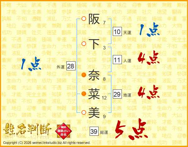阪(7画)下(3画) 奈(8画)菜(12画)美(9画)