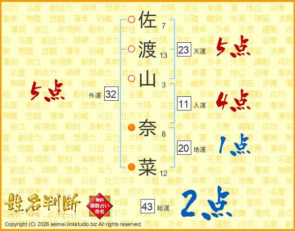 佐(7画)渡(13画)山(3画) 奈(8画)菜(12画)