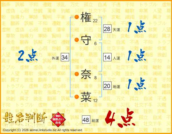 権(22画)守(6画) 奈(8画)菜(12画)