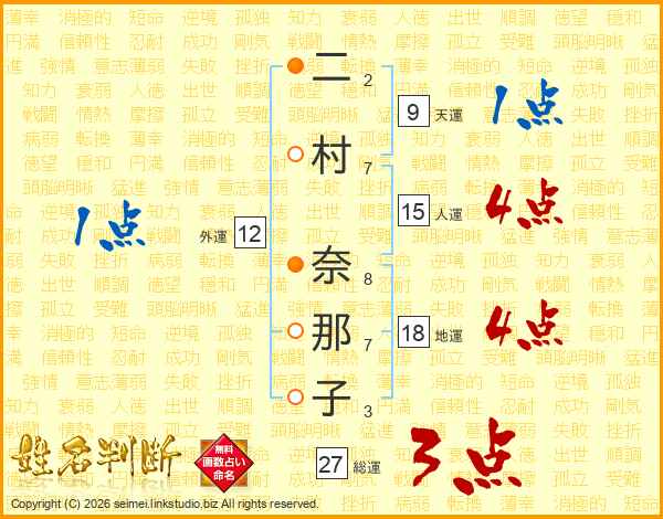 二(2画)村(7画) 奈(8画)那(7画)子(3画)