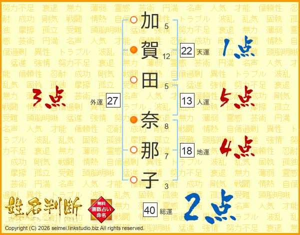 加(5画)賀(12画)田(5画) 奈(8画)那(7画)子(3画)