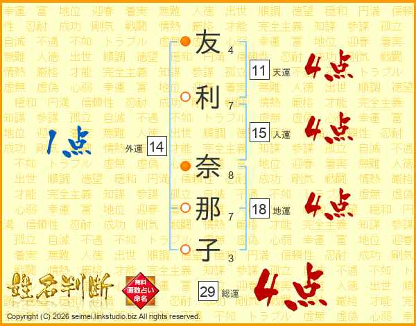 友(4画)利(7画) 奈(8画)那(7画)子(3画)