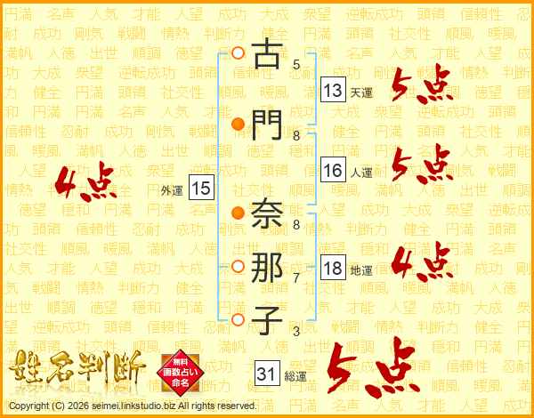 古(5画)門(8画) 奈(8画)那(7画)子(3画)