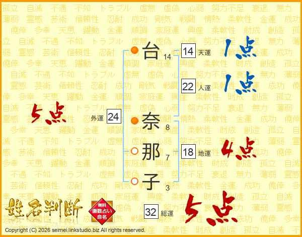 生活面を象徴する運勢です。外部から受ける影響力を表し、結婚運、家庭運や職場、環境への順応性を表します。総運から人運を引いた画数。姓や名が1文字の場合を除く。
