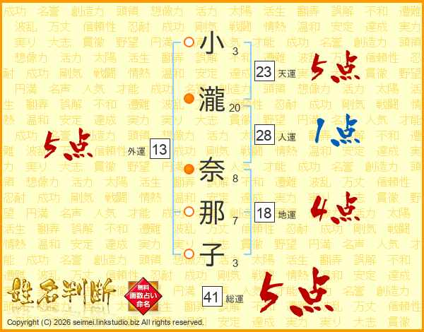 小(3画)瀧(20画) 奈(8画)那(7画)子(3画)