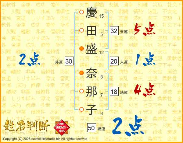 慶(15画)田(5画)盛(12画) 奈(8画)那(7画)子(3画)