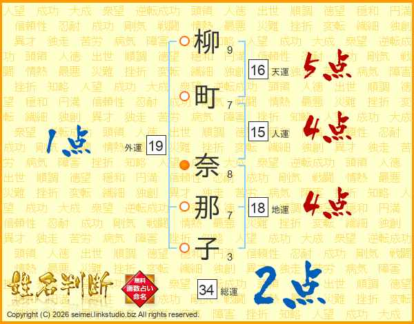柳(9画)町(7画) 奈(8画)那(7画)子(3画)