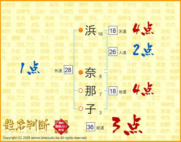 浜(18画) 奈(8画)那(7画)子(3画)
