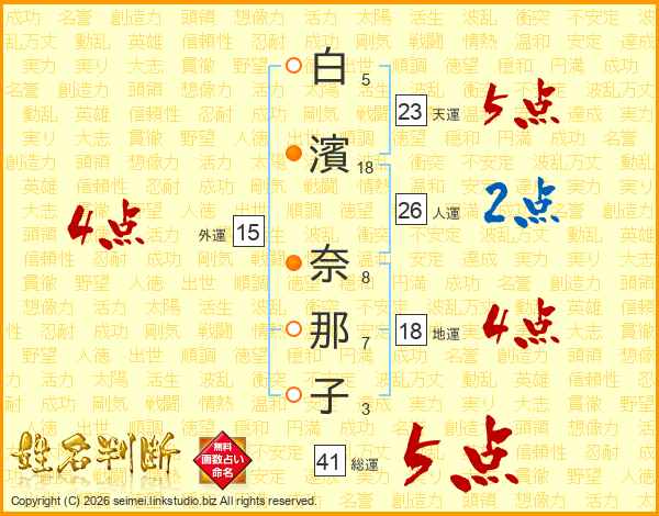 白(5画)濱(18画) 奈(8画)那(7画)子(3画)