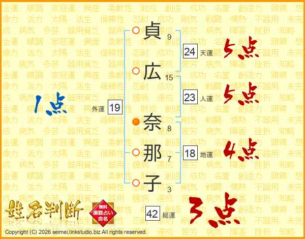 貞(9画)広(15画) 奈(8画)那(7画)子(3画)